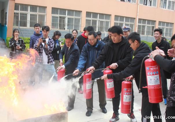第四项为由赵庆航参谋向同学们介绍灭火器的使用方法,并亲自示范如何正确使用灭火器扑灭火焰。领导老师与学生积极参与其中,加强灭火器使用的知识。