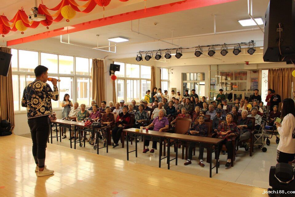 9月21日早上9:30走访敬老院活动同学们到达敬老院与负责人协商后迅速开始布置会场,随后积极搀扶老人们坐上座位。表演开始,学生会成员深情的演唱了一首老人们都喜爱的《军中绿花》以及一首民谣《安河桥》,紧接着三位女生表演了《拳击操》和《跆拳道》,老人们连连拍掌叫好,笑容如阳光灿烂。最后全体同学与老人一同合唱了《歌唱祖国》,老人们边指挥边合唱,气氛很是融洽。时间总是溜走的很快,我们离开时老人还与我们对歌,表达了不舍之情。