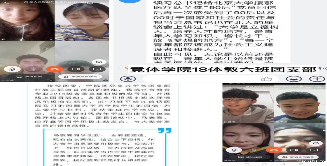 2018级体育教育专业师生根据各团支部实际情况积极商讨组织线上团日活动,以“习近平给在首钢医院实习的西藏大学医学院学生的回信”和“习近平给北京大学援鄂医疗队全体“90后”党员的回信”为主要学习材料,带动全年级同学精读、细读,并结合新时代青年学生的使命与担当、理想与爱国、奋斗与拼搏展开线上大讨论。团日活动凝聚了同学们的爱国心声,激发了同学们勇于担当,争做时代好青年的信心与决心。