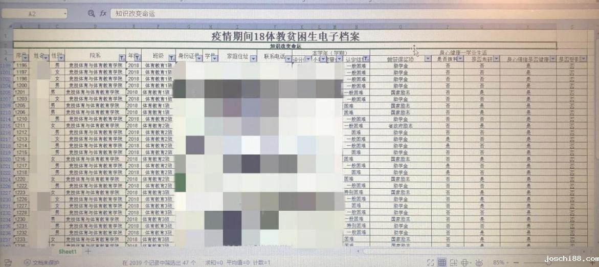 2018级体育教育专业有47名贫困生,其中3个是建档立卡家庭学生,4个单亲家庭学生。1月20日—2月20日,辅导员对困难家庭的学生开展线上“一对一、面对面、心对心”心理教育和疏导。通过微信、QQ、电话等形式主动慰问联络47名贫困学生,逐一落实排查他们的健康状况,建立个人电子档案,落实落细生活、学习、心理等各项问题,及时推送解读各级各类扶贫政策文件,鼓励学生树立信心。个人花费千元网购米、油、面等生活必需品寄送给困难家庭的学生。疫情无情,人有情,守望学子,播种中国特色社会主义核心价值观,是“90后”青年辅导员教师的基本职责。