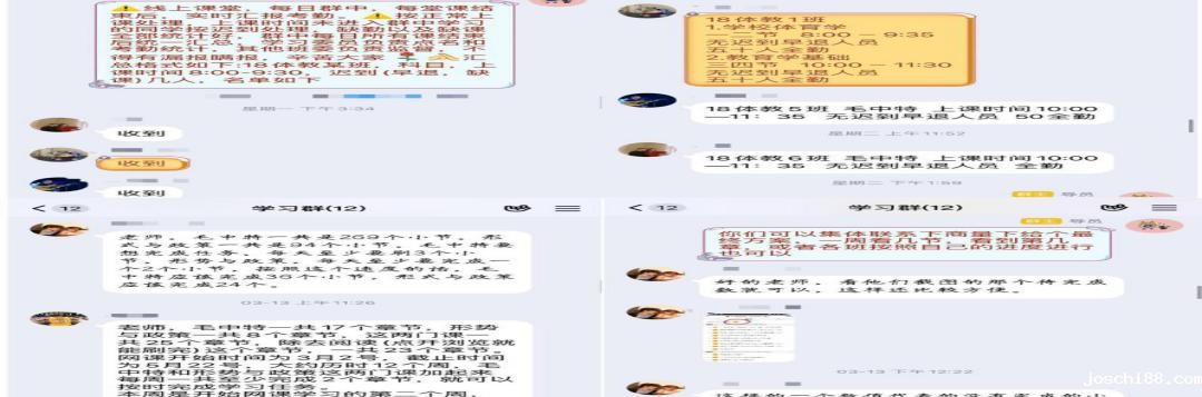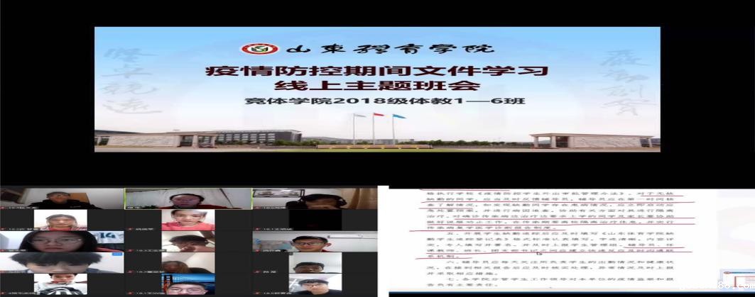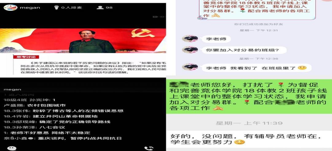 学校3月2日开始线上教学,学校体育学、教育学、毛泽东思想和中国特色社会主义理论体系概论,形势与政策等一批线上课程陆续开课,为引导学生积极主动开展在线学习,提高学习兴趣,规范班级学风建设,完善班级管理制度,根据各班课程安排情况、各类职业资格考试报考情况,充分发挥学生干部、入党积极分子的主体作用,开展以思想引领、线上考勤、随机听课、学习群组为中心的学风建设教育。组织开展了5场“疫情期间线上学习文件主题班会”,精准解读校内外21个重要文件通知,强化学生的集体主义意识和规则意识,督促学生遵守校规校纪,养成良好行为习惯。利用QQ、微信等社交平台建立辅导员-学生干部-学习考勤反馈群等学生沟通机制。每天及时掌握每堂课学生出勤信息以及课堂纪律表现情况,建立问责、追责制度,严格管理线上课堂出勤。并跟班听课了解学生学习状态,走进学生、了解学生、督促学生。同时要求同学们成立学习群组,实时分享学习成果,制定每周学习计划,及时将本堂课的课程资料共享群中,确保同学们能第一时间获得学习资源。根据学生兴趣爱好成立年级打卡小组,提高学生自主参与学习的能动性,把教学相长延伸到线上课堂之外,因材施教,优势互补。