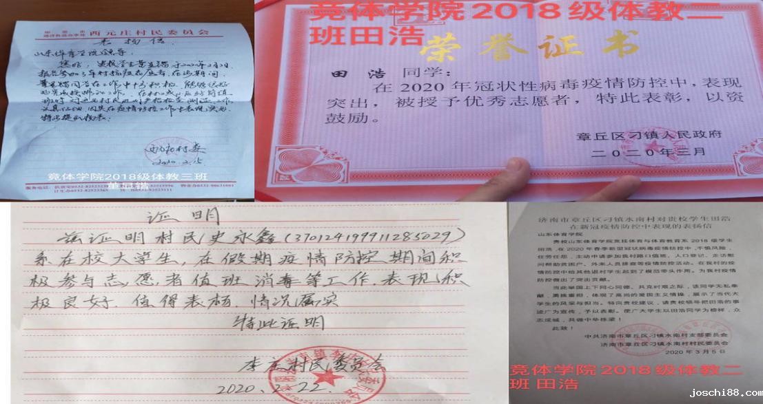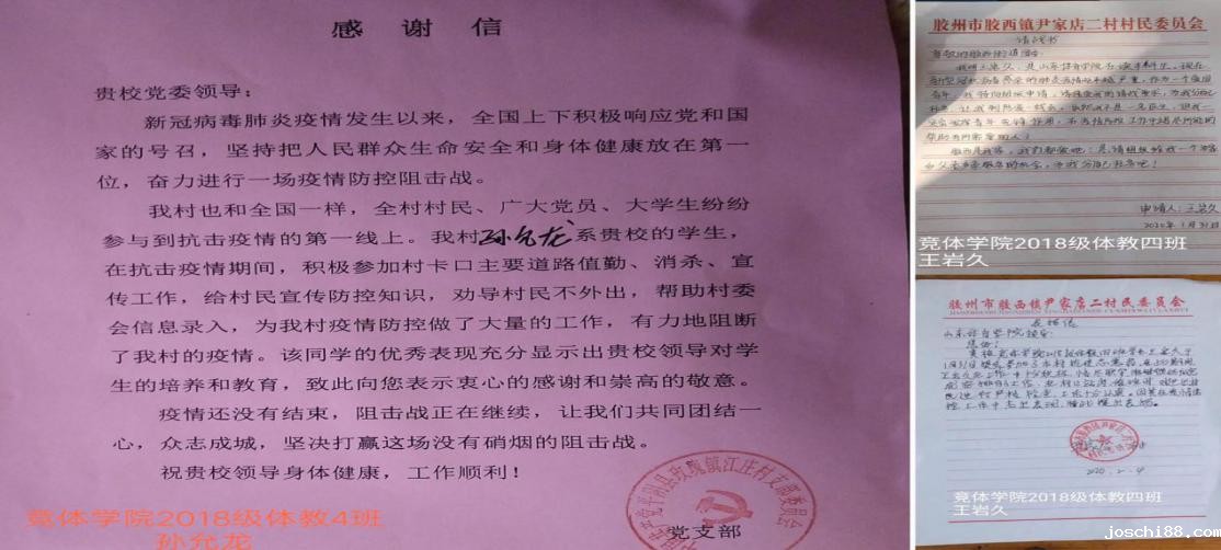 2018级体育教育专业的学生在战“疫”中描绘雷锋精神新画卷。13名学生在加强自我防护的同时,主动投身阻击疫情的任务当中,成为主动参与城乡基层群防群治工作的青年志愿意者,把参加打赢疫情防控阻击战作为检验自己初心和使命的重大社会实践。截止到3月27日,已收到同学们所在的镇政府、村委会的6封表扬信、感谢信和1封请战书。又不失时机地召开线上主题班会,开展青年理想信念教育,树立学生身边的先锋模范。在“疫情当前,如何做好新时代山体青年”的专题讨论上,13位防疫志愿者同学分享了各自的战“疫”故事,同学们血脉喷张,纷纷表示,要更加努力学好本领,以行证道,报效祖国。