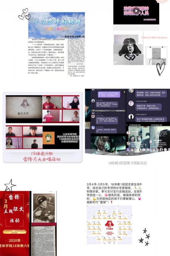 “雷锋月”期间,2018级体育教育专业学生从思想上的响应发展到行动上的自觉,组织开展形式多样丰富多彩的线上“雷锋月”系列活动。同学们用实际行动贡献自己的青春力量,传承雷锋精神,让青春在战“疫”中绽放绚丽之花。