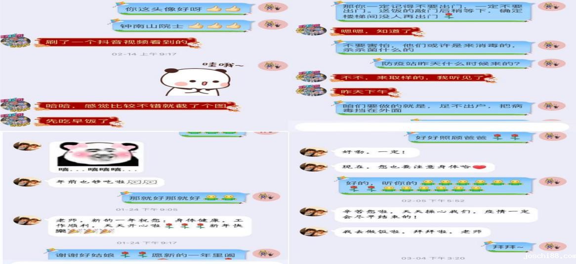 2月5日,辅导员接到一名学生的电话。原来这名学生因为与一新冠肺炎确诊患者曾在同一家超市打工,被要求进行取样筛查并在指定宾馆隔离14天。除了第一时间上报学校、填写台账外,立即对这名学生展开了心理疏导教育,运用专业的共情、转移、引导、安抚等交谈策略,及时缓解了学生紧张焦虑的情绪,帮助学生树立必胜信心。14天里,每天QQ视频连线学生,观察该生的健康、心理状况,为他解答学业、交友和择业等问题。在保护学生隐私的情况下,发动学生的好友与家人共同参与到心理疏导教育中,构筑校家一体抗“疫”的心理防线,及时控制、调节、消除疫情给学生带来的心理伤害,用人文关怀构建心理防护的坚实堡垒。在教育帮扶学生的同时,有意传授学生心理自助方法,例如学会评估个人情绪状态、控制情绪6秒冷静法,有时深入交流长达2小时。希望通过这样的方式使学生在日后面对困难处境时不仅可以自助还能为他人提供帮助。隔离的第11天,学生将QQ头像换成了钟南山院士抗击疫情的漫画,对于一个处在隔离期的孩子,这个头像将这段时光赋予了深刻意义,是对钟南山院士的敬佩,是对未来美好生活的坚定!