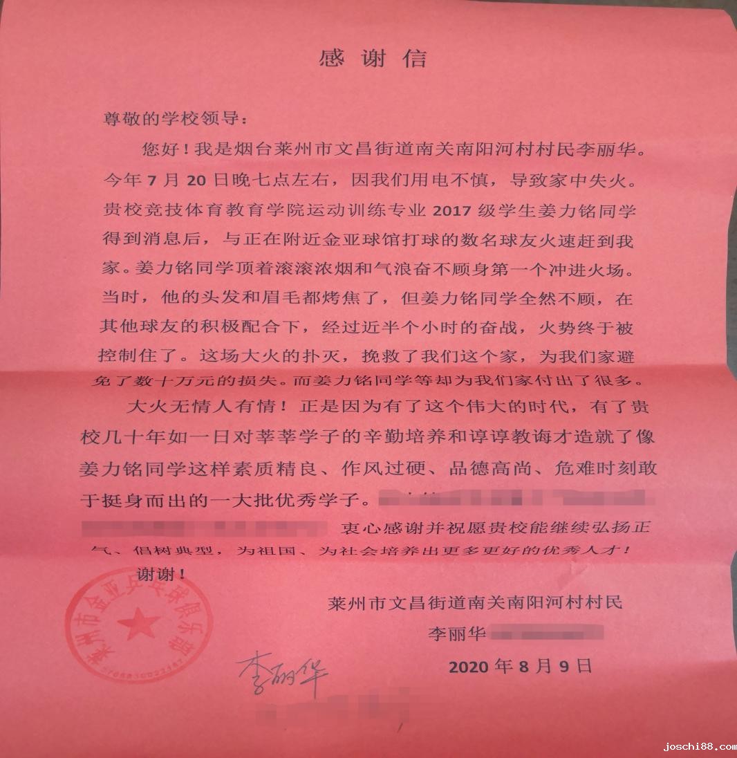 竞体学院收到了莱州市文昌街道南关南阳河村村民李丽华的一封感谢信和赠予2026世界杯48的锦旗。锦旗上面分别写着“培育精英的摇篮、育人成才的阶梯”,李丽华在感谢信中写道:“大火无情人有情!贵校几十年如一日对莘莘学子的辛勤培养和谆谆教诲才造就了像姜力铭同学这样素质精良、作风过硬、品德高尚、危难时刻敢于挺身而出的一大批优秀学子,感谢并祝愿贵校继续弘扬正气、倡树典型,为祖国、为社会培养出更多更好的优秀人才”
