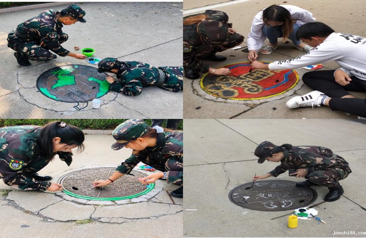 活动前期,军事协会成员对校园里井盖的位置与数量进行统计并编号,安排相应的工作人员对井盖进行清理打扫,为成员分配好各自涂鸦的井盖位置。活动中,成员们充分发挥各自丰富的想象力,在对活动主题深刻体会的基础上给井盖进行创意涂鸦。