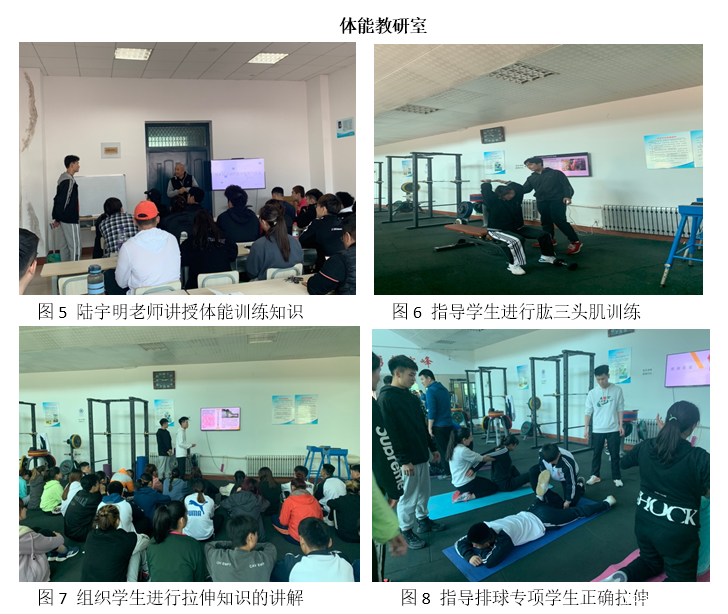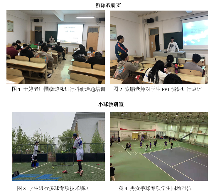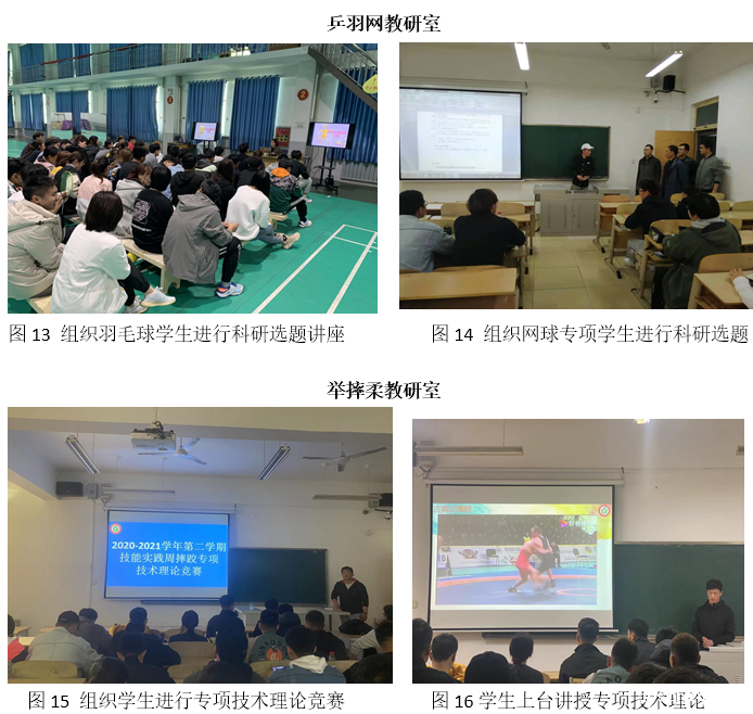 “对于我们大一、大二学生,现在开始自主科研选题是否太早?”、“巾帼不让须眉,谁说女子不如男?”、“针对每一块肌肉,如何进行针对性训练?”、“平时训练准备得很充分,一到比赛就紧张,总是发挥不出正常水平?”、“大学期间如何提高裁判理论知识和实践能力?”、“对于大一、大二学生,现在开始毕业论文选题与设计是否太早?”、“即将进入实习阶段,如何将学校所学理论知识和实践结合?”等类似这样的问题,专项老师应多与学生交流沟通,并给予很好的回答。4月27日,实践周第二天,各教研室紧密围绕学生提出的问题,积极引导,系统梳理,在与学生的探讨、辩论和组织的多样化的实践活动中给予很好的解答。