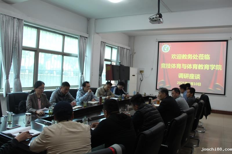 5月10日下午,教务处处长张佃波、党总支书记兼教务处副处长王立平、体育传媒与信息技术学院副院长兼日照校区教学管理部副主任马飞、教务科闫红桥、教学科李荀一行来我院调研座谈。竞体学院全体领导班子成员、教学秘书以及各教研室主任、副主任参加了此次会议,会议由院长吴耀宇主持。