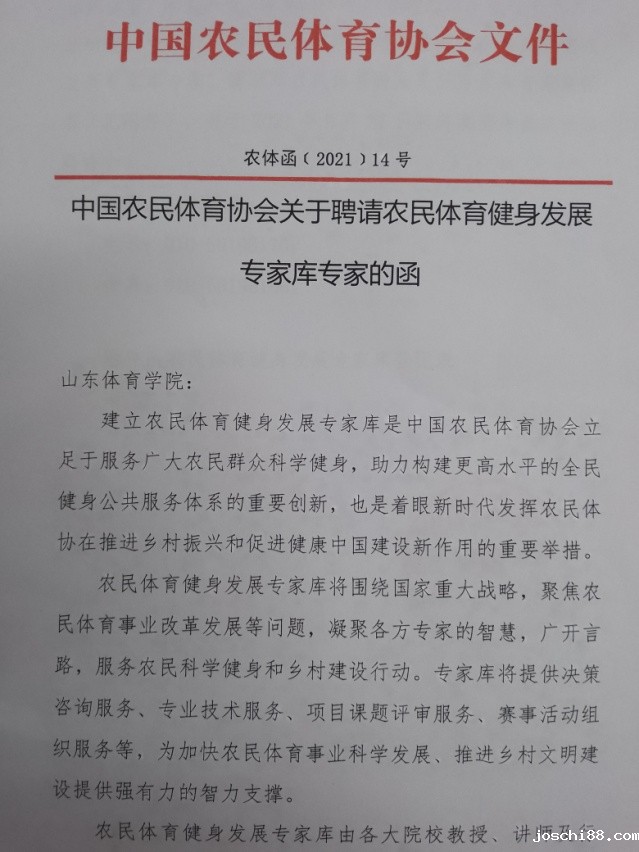 根据国家农业部、国家体育总局和国家乡村振兴局有关农民体育工作的文件精神,中国农民体育协会于今年成立了“农民体育健身发展专家库”,我院赵亮博士受聘成为“农民体育健身发展专家库”专家。