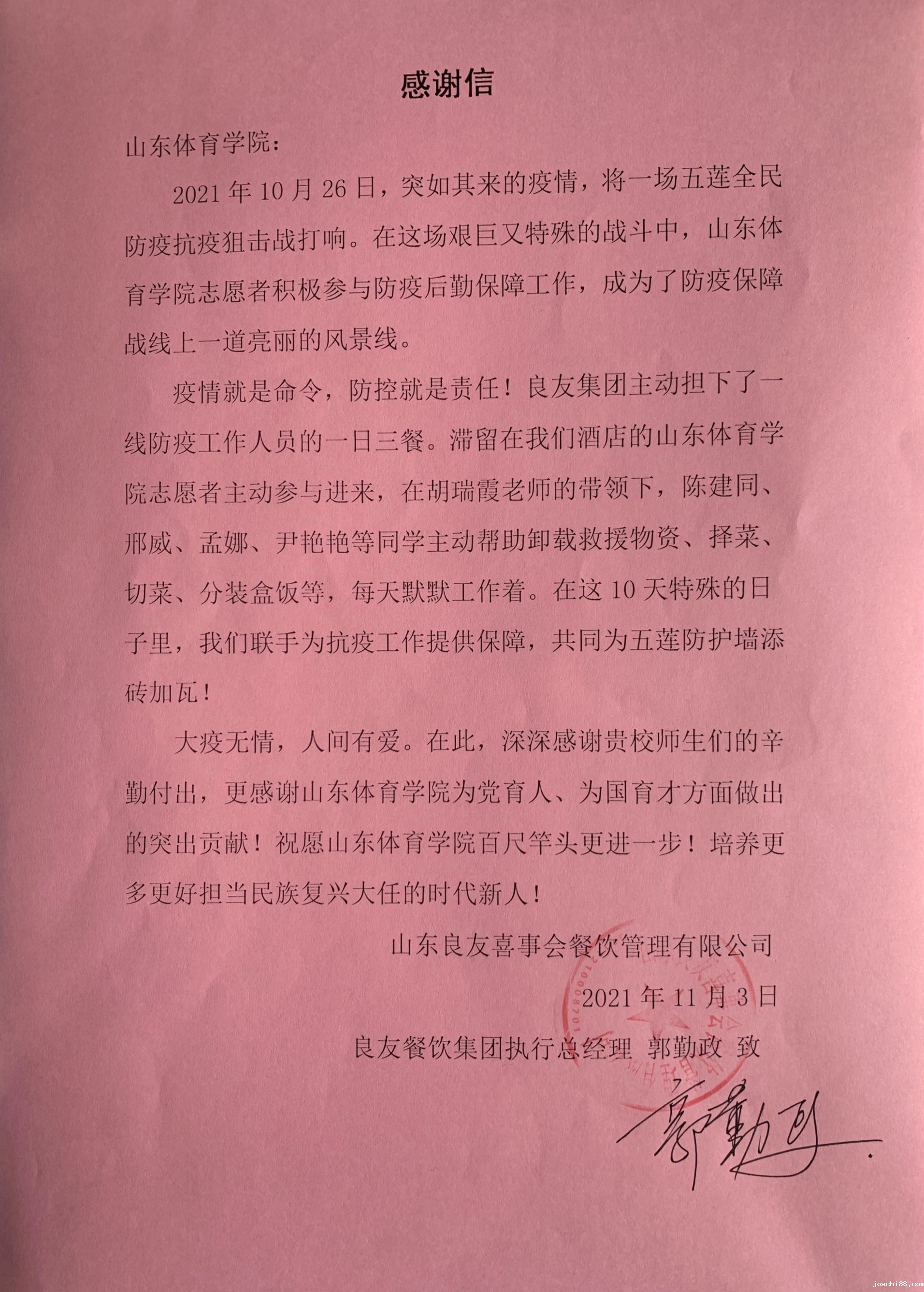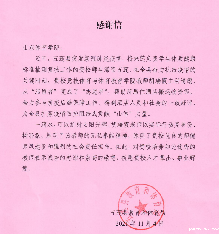 团队成员展现出的“担当、奉献、合作”精神以及“山体力量”深受校内外师生及校外各界的一致好评,五莲县教育和体育局为此特意发来感谢信,对滞留当地师生的抗疫工作和贡献表示感谢。