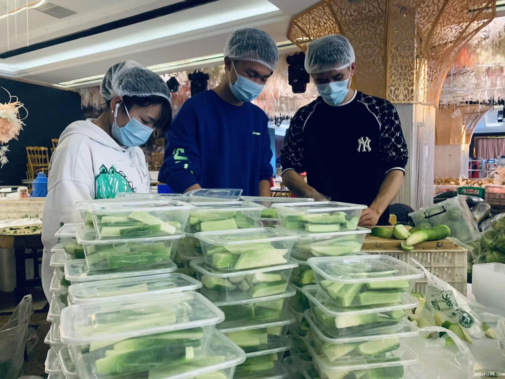 胡老师及团队中的学生自愿积极加入志愿者团队,在自己力所能及的范围内,全心全意进行抗疫工作。经了解,团队所住的酒店是专门向疫情防控工作人员和有需求的群众配送盒饭的供应点,团队所有成员在熟悉环境后,第一时间投入到工作中,主要进行协助装卸救援物资、择菜、切菜、分装盒饭等一些基础工作。