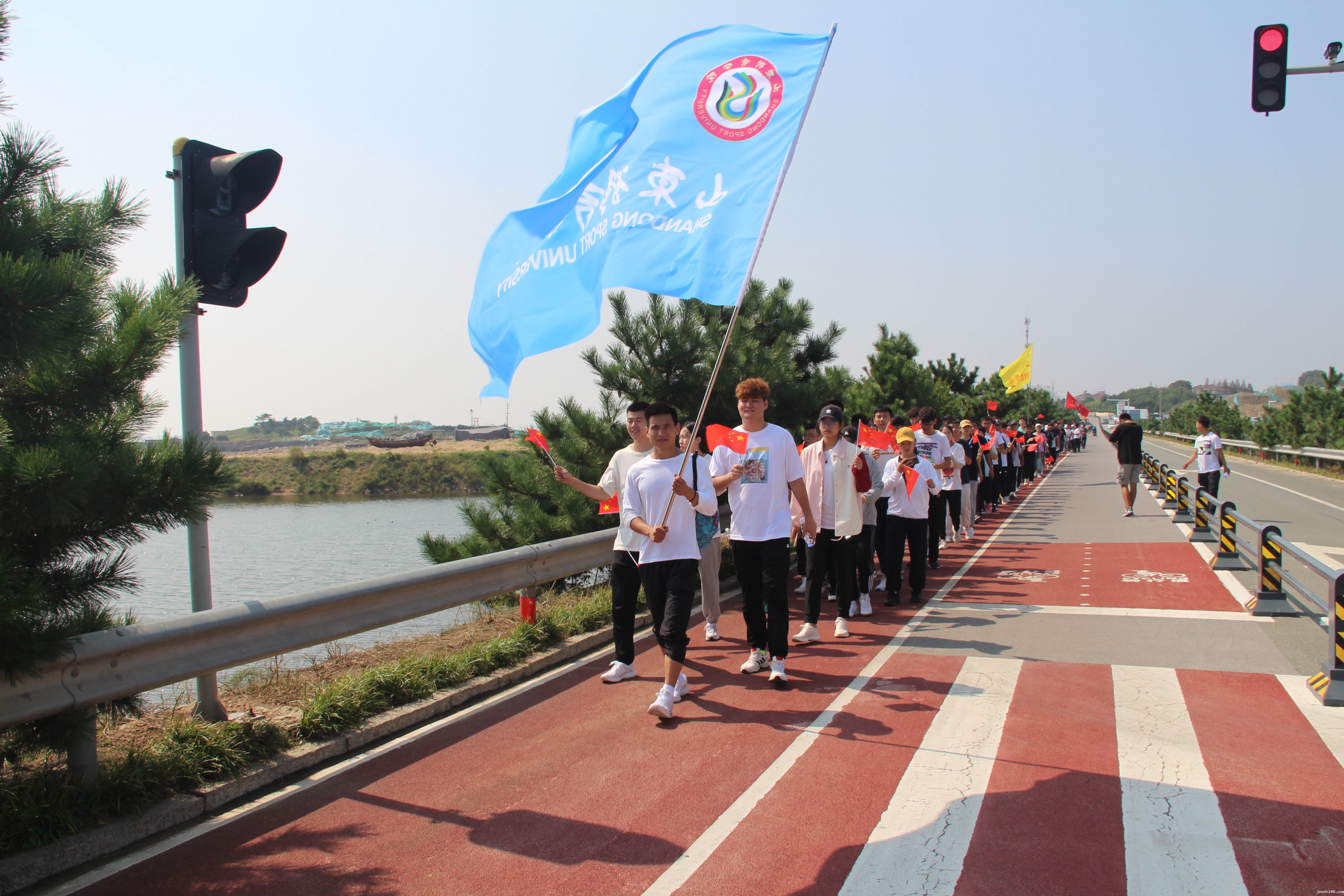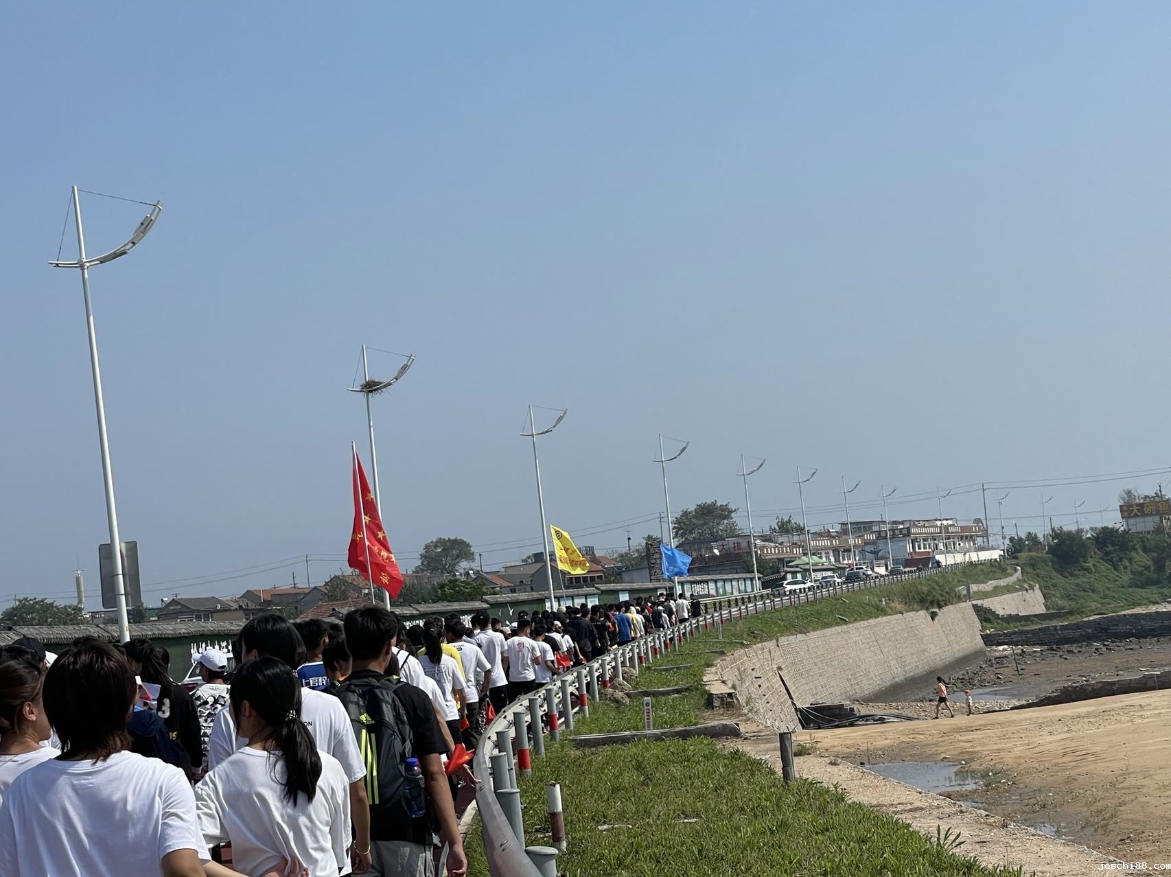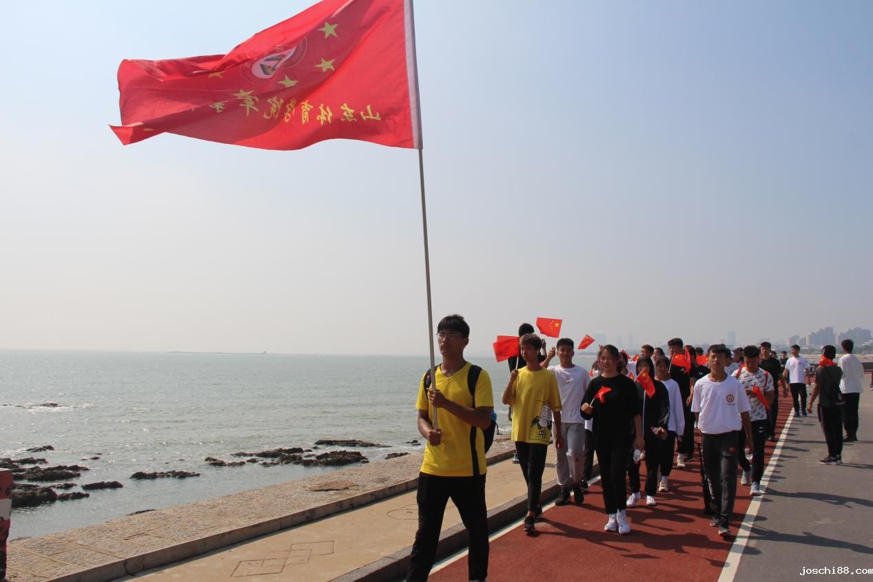 第三部分徒步活动正式开始,本次徒步活动全程大约10公里,活动起点为校南门,途径东夷小镇、山海天、张家台,终点为桃花岛。徒步途中大家一路高唱红歌,呼喊口号,队列安全有序的行进,行进过程中同学们克服体能消耗及天气闷热的困难,始终保持着高昂士气,饱满热情,积极投入,按照既定路线圆满完成任务。
