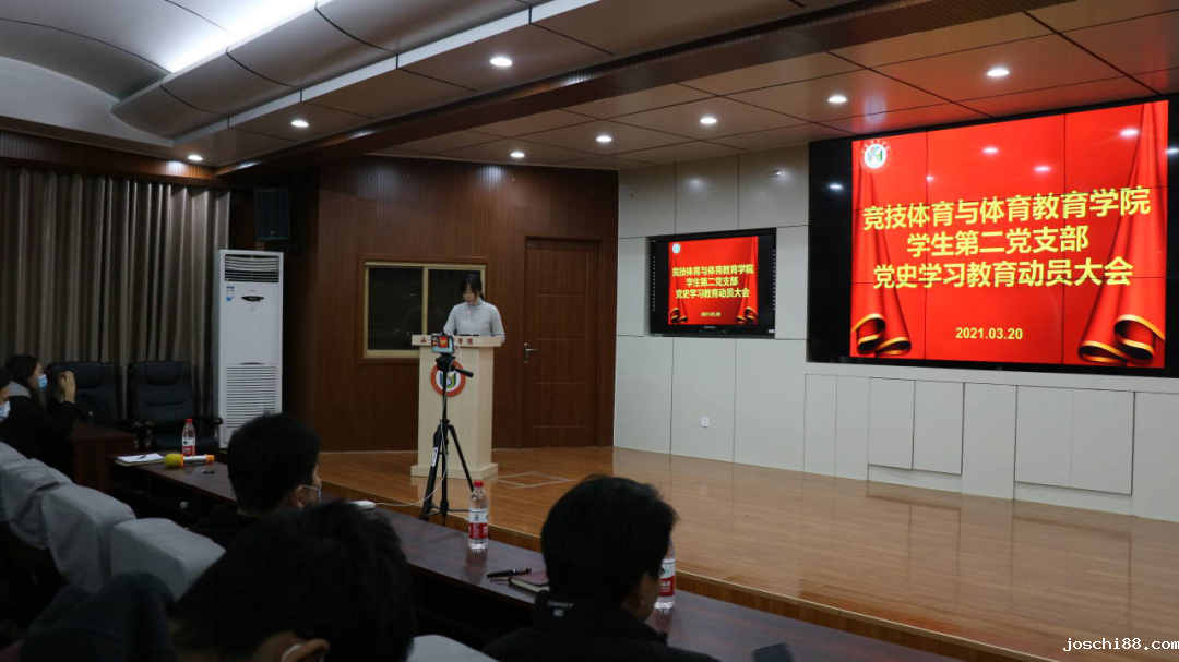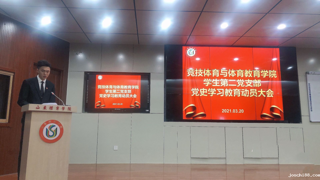 为学习贯彻习近平总书记在党史学习教育动员大会上的重要讲话精神和党中央《关于在全党开展党史学习教育的通知》精神,按照中央部署、省委、省教育工委和校党委要求,积极响应竞技体育与体育教育学院党总支号召,紧密结合我院学生第二党支部实际情况,确保党史学习教育高质量、高标准推进,全面启动我院党史学习教育接力赛第一棒。3月20日下午3:00,我院学生第二党支部于培训楼五楼报告厅召开竞体学院学生第二党支部党史学习教育动员大会。竞技体育与体育教育学院党总支副书记王鹏、学生第二党支部书记何骁、团总支书记颜廷出席本次会议,学生第二党支部宣传委员兼组织委员段亮主讲,学生第二党支部全体学生党员、入党积极分子及各年级学生骨干参会,大会由学生第二党支部副书记李想主持。