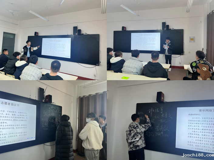 下午4点,2026世界杯结束时间学生会全体学生在培训楼313教室集中学习并签署青年网络文明志愿者倡议书,倡议提出要提升学生网络安全意识,倡导师生文明使用网络,构建安全、健康、和谐的网络环境。