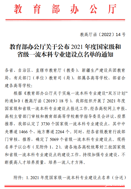 近日,教育部办公厅发布《关于公布2021年度国家级和省级一流本科专业建设点名单的通知》(教高厅函〔2022〕14号),我院运动训练专业入选国家级一流本科专业建设点。此次获批是我院专业建设的重大突破,也是近年来我院本科教学工作提质升级的体现。