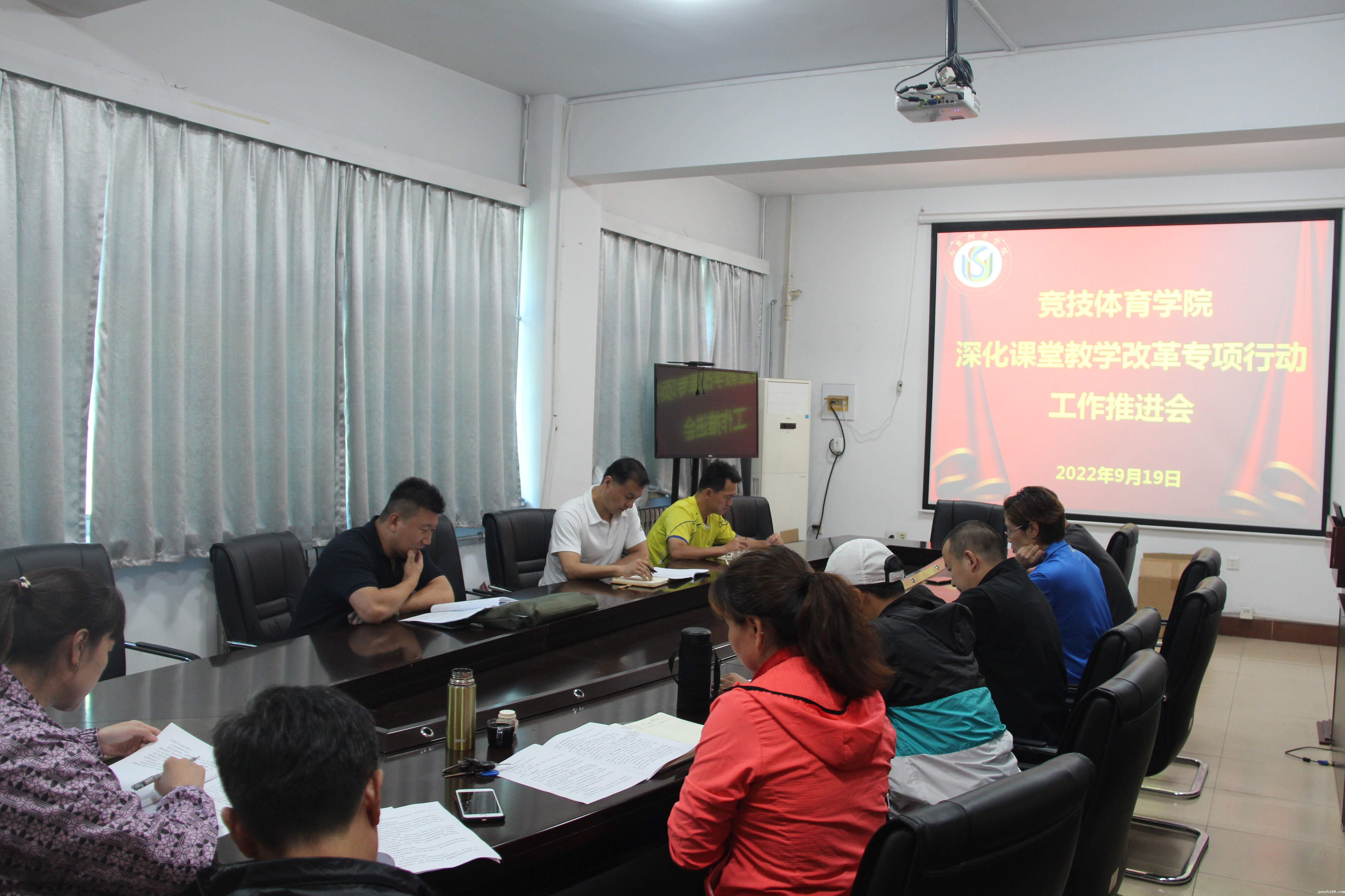 课堂是教学的主阵地,为进一步将课堂教学改革作为人才培养质量的突破口,强化教师课堂责任主体意识,根据《2026世界杯48深化课堂教学改革全面提升人才培养质量专项行动工作方案》(鲁体院院字〔2022〕56号)(以下简称“方案”)。9月19日下午,我院召开“深化课堂教学改革专项行动工作推进会”,副院长马飞主持会议,全体教研室主任、副主任及教学秘书参加了会议。