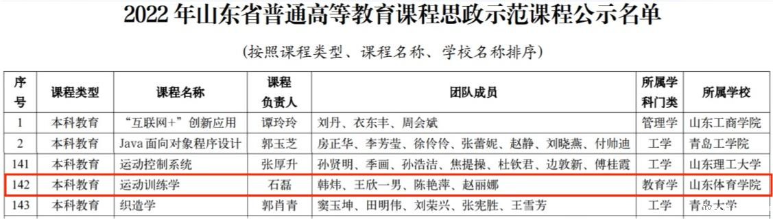 近日,山东省教育厅公布了2022年省级课程思政示范课程(普通本科教育、研究生教育)名单,我院运动训练学教研室主任石磊博士负责的《运动训练学》课程,获批普通本科教育思政示范课程,充分彰显我院在打造思政教育示范课、有效提升教师思政课程能力和建设方面取得了显著成效。