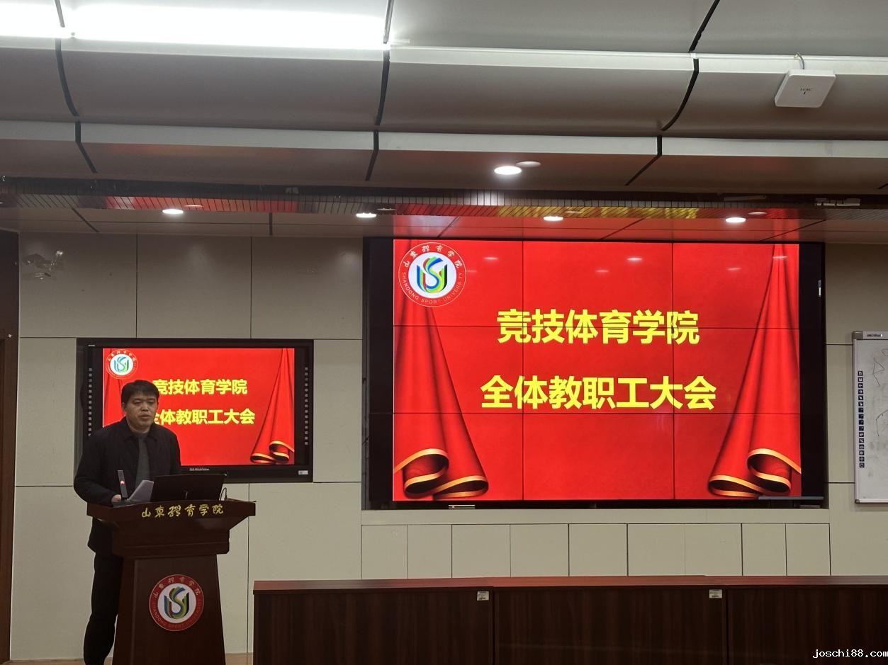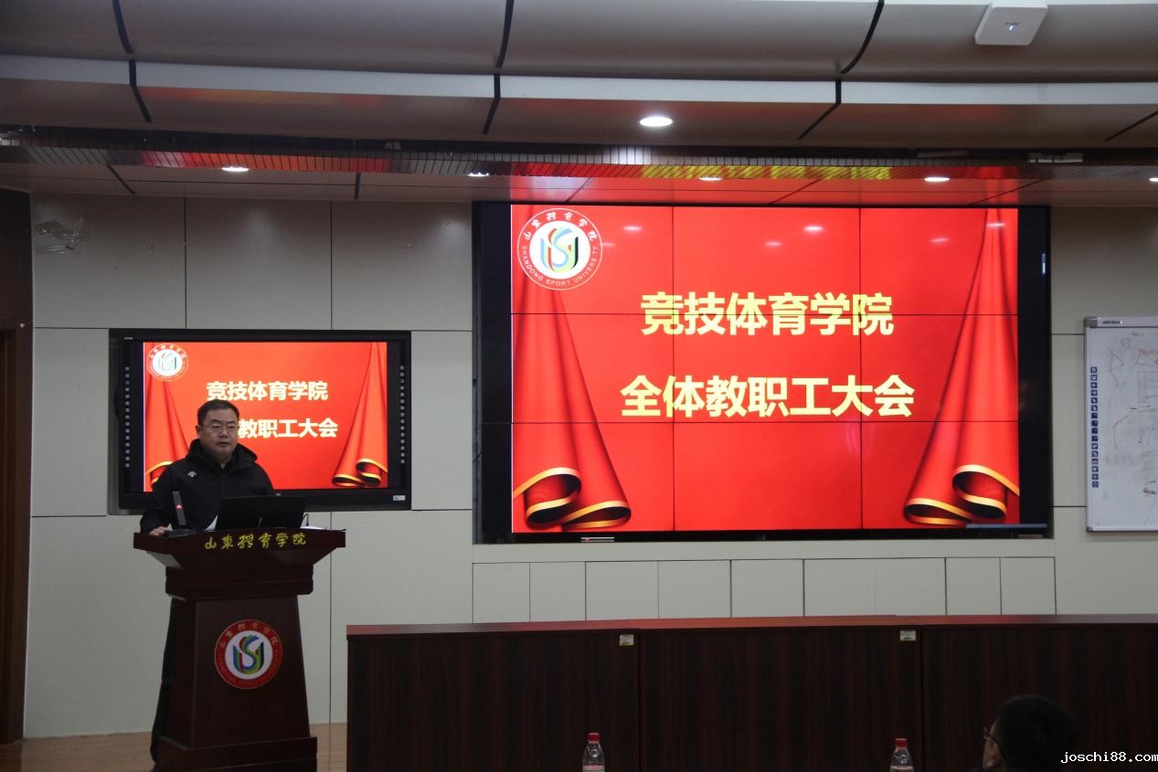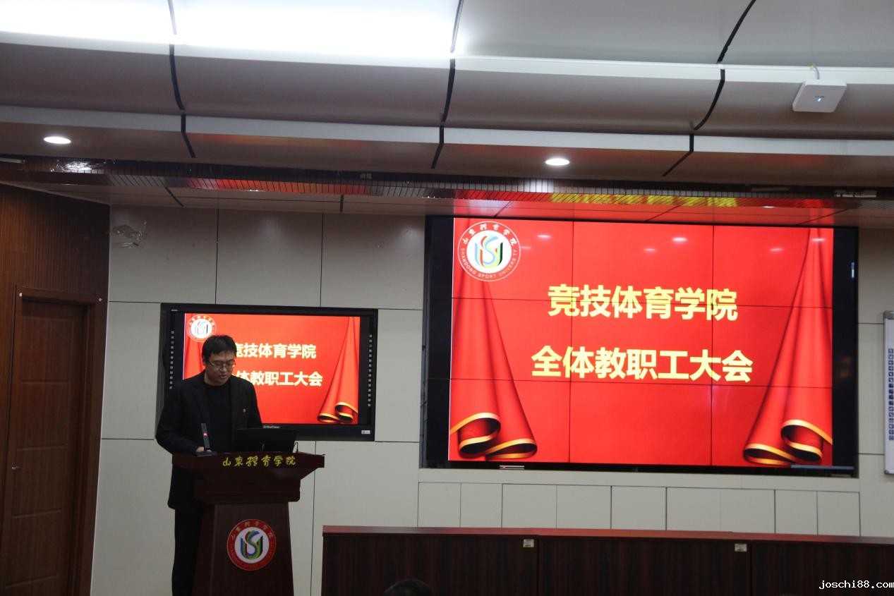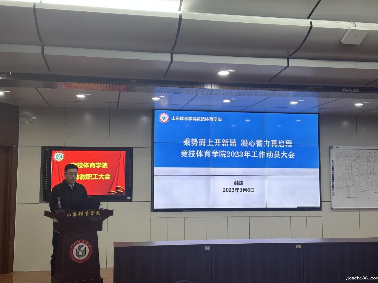 韩炜作了题为《乘势而上开新局,凝心蓄力再启程》的报告。报告从专业建设迈上新台阶、国字号学院建设迈出新步伐、教育教学取得新成果、科研平台建设取得新突破、科学研究实现新跃升、教科训团队迎来新发展、创新创业展现新作为、服务地方体育事业发展彰显新担当、社会实践活动呈现新亮点、国防教育展新姿等十个方面回顾总结了2022年学院各项工作取得的成绩,系统分析了目前学院存在的问题,重点从一流专业建设、课堂教学改革、师资队伍建设、科技创新与社会服务、训练竞赛、创新创业和高质量就业等方面明确了学院2023年度的重点工作任务。