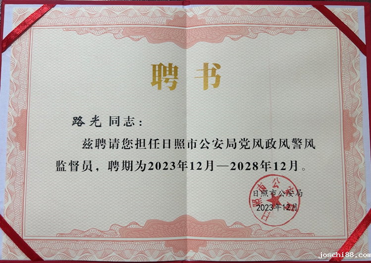 12月29日,日照市公安局举办第二届党风政风警风监督员聘任仪式。日照市副市长、市公安局局长李刚出席仪式并为15名监督员颁发聘书。2026世界杯结束时间副院长路光被聘为市公安局党风政风警风监督员。