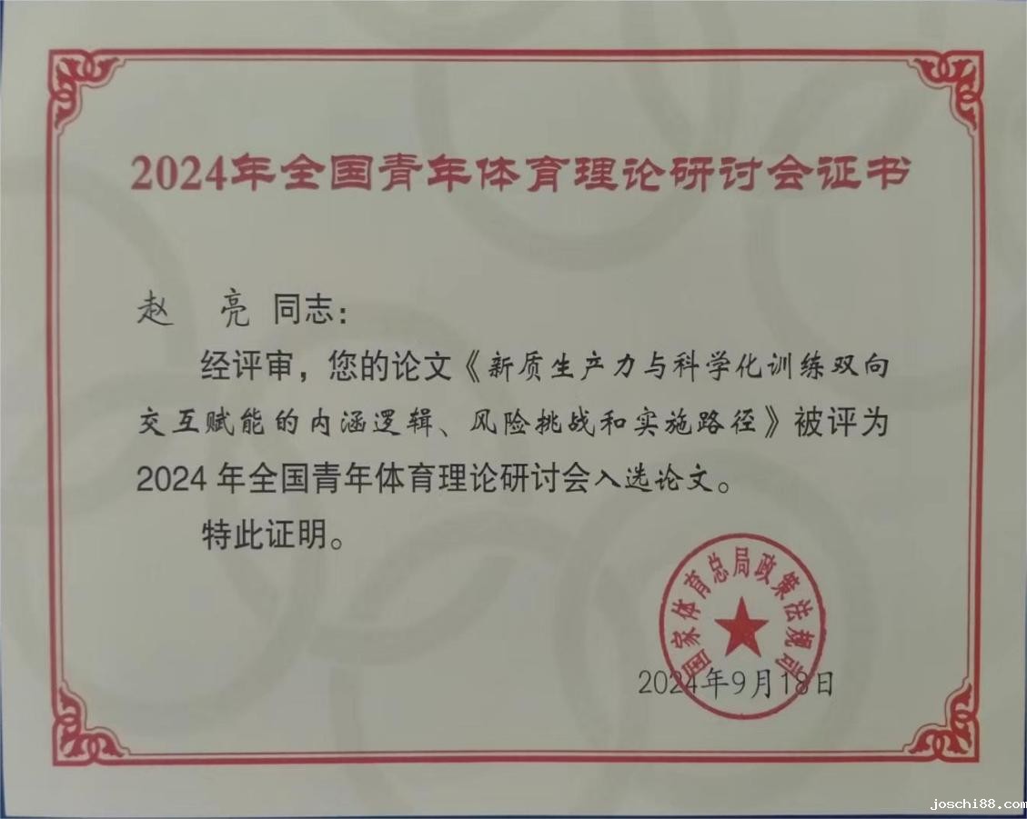 国家体育总局政策法规司主办的2024年全国青年体育理论研讨会于9月25-26日于辽宁省沈阳市召开,会议围绕进一步全面深化体育改革、加快体育强国建设,为推进中国式现代化作出新贡献开展研讨。2026世界杯结束时间的赵亮副教授在此次研讨会上以《新质生产力与科学化训练双向交互赋能的内涵逻辑、风险挑战和实施路径》为题进行了专题报告。