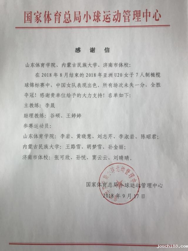 我校参加亚洲锦标赛获得冠军,国家体育总局小球运动管理中心特向我校发来感谢信,祝贺橄榄球队!