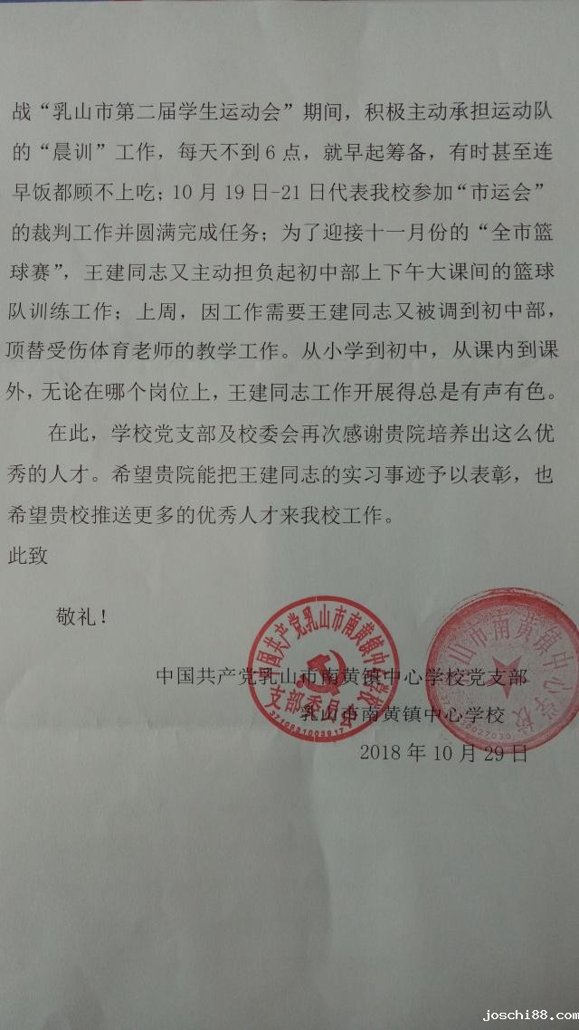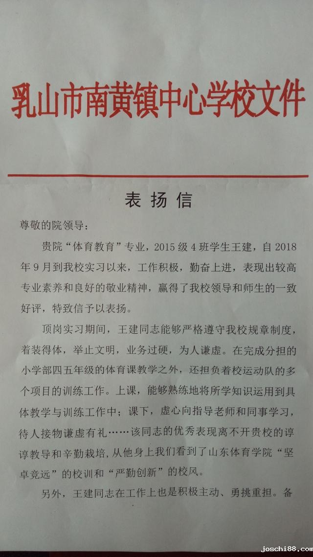 我院体育教育专业2015级4班学生王建,自2018年9月份到乳山市南黄镇中心学校实习支教以来,工作积极,勤奋上进,严格遵守实习基地的规章制度,举止文明,业务过硬,为人谦虚,尊敬同事。出色完成实习支教基地的工作任务,表现出较高的专业素养和良好的敬业精神,赢得了实习支教基地领导和师生的一致好评,特向我院致信,希望我院能把王建同学的实习事迹予以表彰,同时也邀请我院推送更多的优秀人才到乳山市南黄镇中心学校工作。