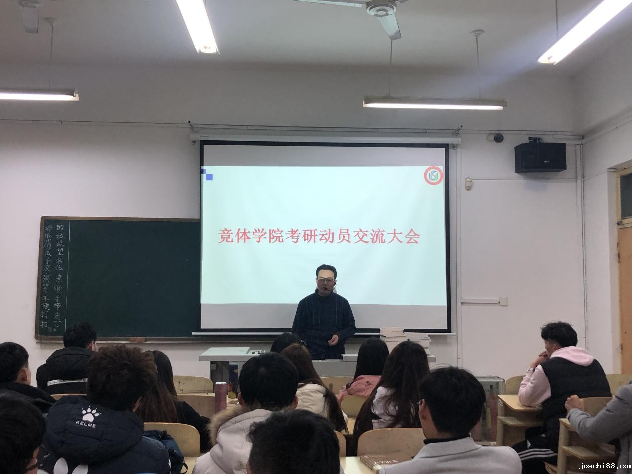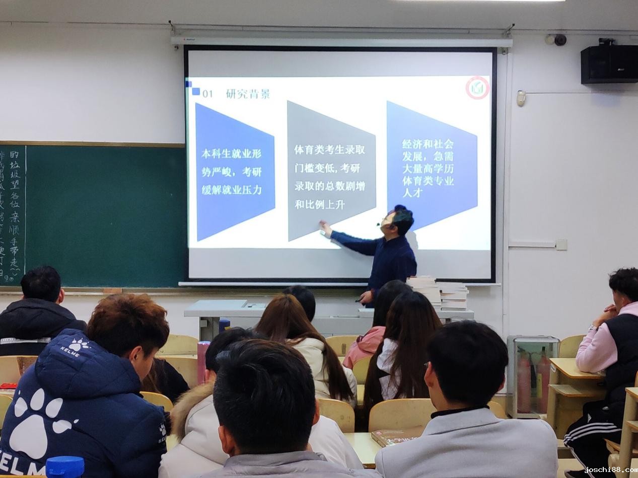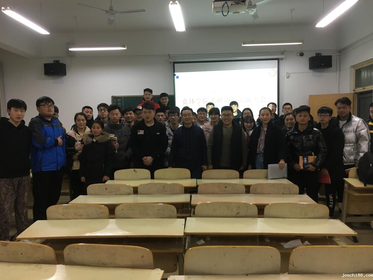 武善亮老师就研究背景和考研现状,向学生们表明了本科生就业情况的严峻,以及随着经济和社会的发展,急需大量高等学历和体育类专业人才。更是通过考研对个人和集体的意义以及许多往届学生的案例,直接切入主题并给同学们提供了宝贵建议,并邀请2015级成功过线北体、成体、中山大学的三位同学在英语、专业课和政治方面上台进行经验交流,为2016级的学生们传授的经验里具体到了看什么样的网课,刷什么样的题,刷哪个老师的题。2015级的三位同学们将他们摸索出来所有精华的东西,以课件的方式一一展现在同学面前,既清晰又深刻,使同学们都受益匪浅。本次讲座,院党总支书记赵孝彬还为考研学子募捐了40本考研资料,以表示对同学们考研的大力支持。